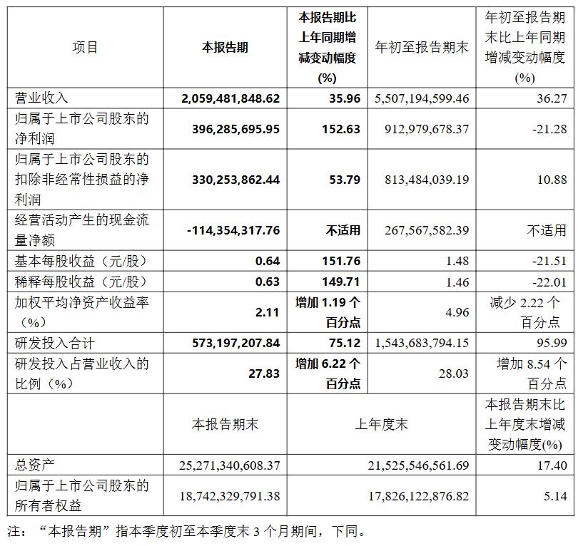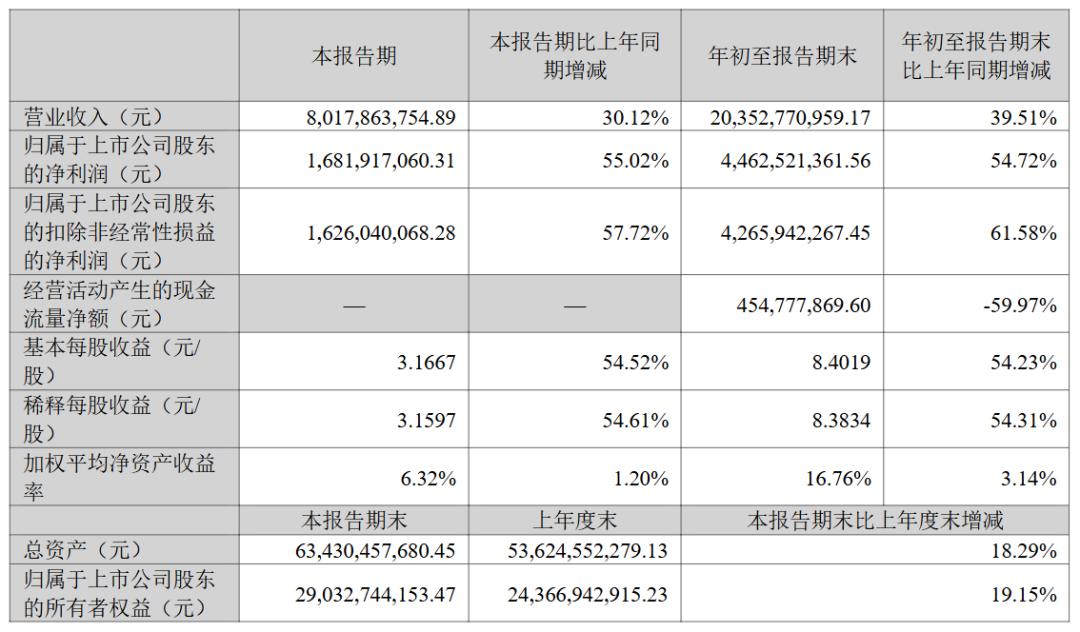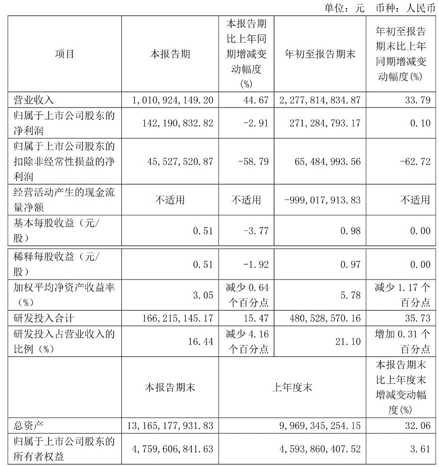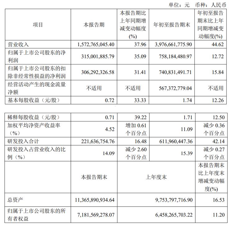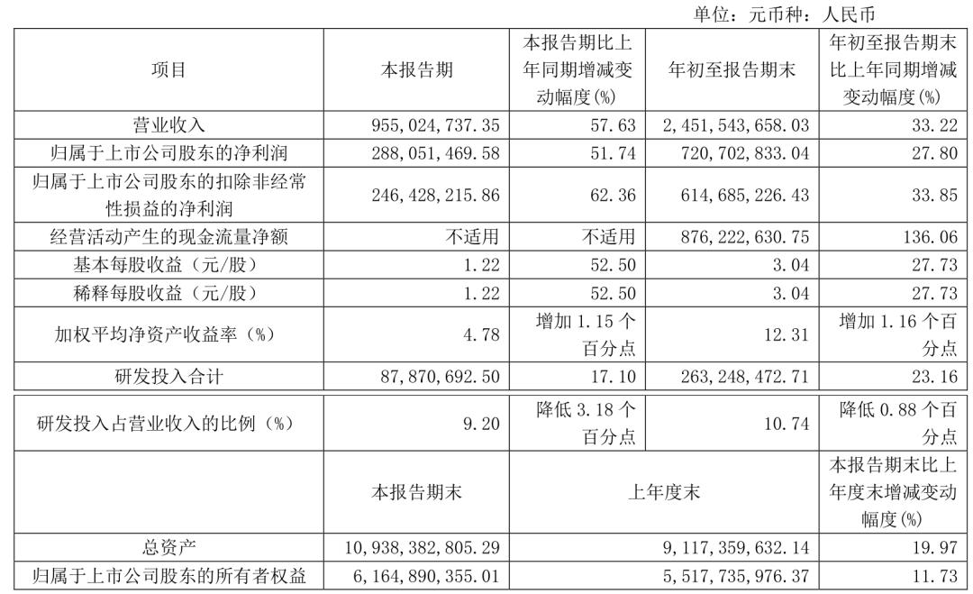 第三季度,该公司实现营收为9.55亿元,同比增长57.6%;归母净利润2.88亿元,同比增长51.7%;扣非归母净利润2.46亿元,同比增长62.4%。截至三季度末,该公司总资产109.38亿元,较上年度末增长20.0%;归母净资产为61.65亿元,较上年度末增长11.7%。