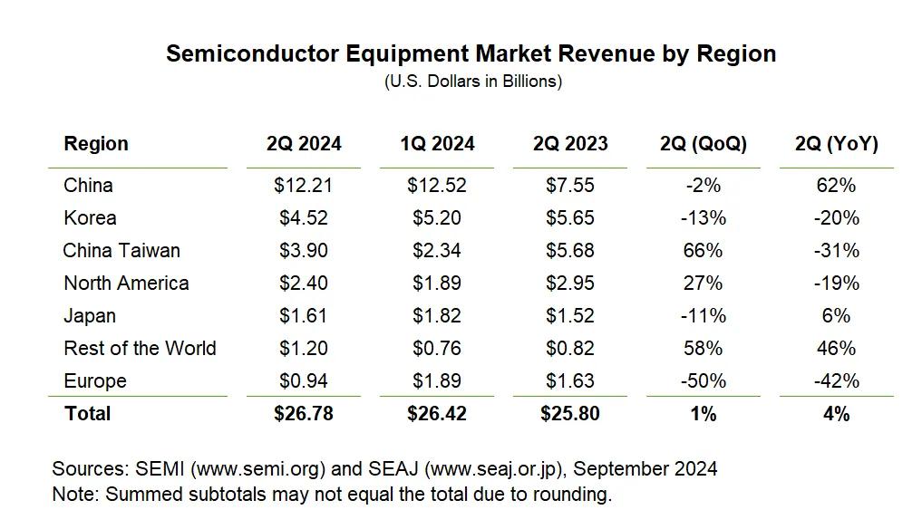 SEMI在其发布的《全球半导体设备市场报告》中宣布,2024年上半年,全球半导体设备出货总额为532亿美元,反映了迄今为止整个行业的健康状况。在战略投资的推动下,半导体设备市场已经恢复增长,以支持对先进技术的持续强劲需求,各个地区也在致力于加强其芯片制造生态系统。