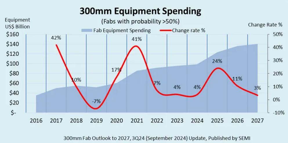 预计到2027年,中国将保持其作为全球300mm设备支出第一的地位,未来三年将投资超过1000亿美元。