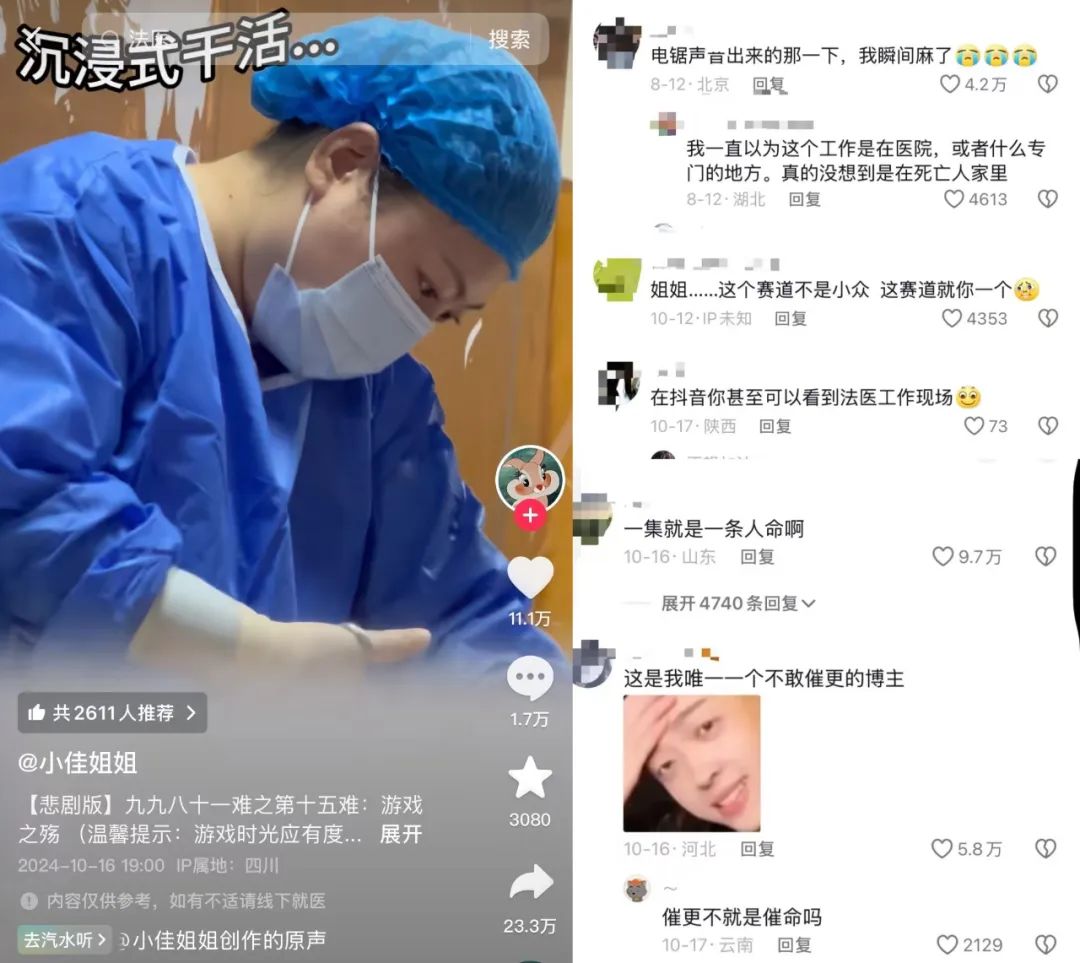 “反人类”Vlog满足了观众对特殊题材以及不同于普通生活的好奇心。 @法医小子(客气版)@小佳姐姐 等创作者,他们的职业相对特殊,工作内容也具有一定的“神秘性”,可以给观众带来不一样的视角和体验。