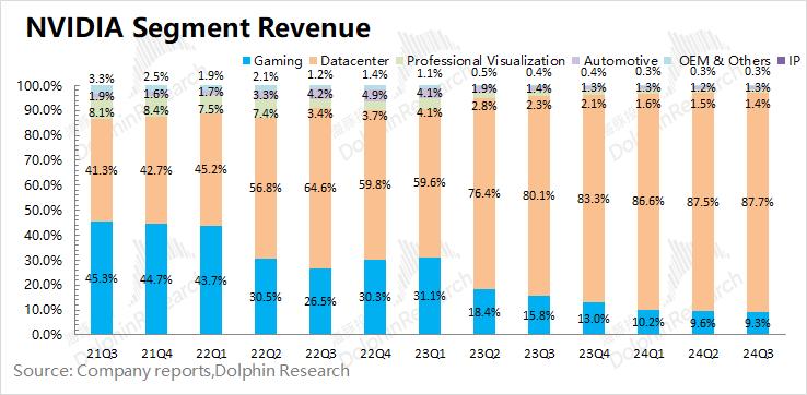 1)本季度游戏业务同比增长14.8%,继续回暖。海豚君认为公司本季度游戏业务增长,主要是受公司游戏显卡份额提升的影响。结合本季度全球PC市场同比0.9%的增长以及同期AMD游戏业务大幅下滑来看,公司本季度主要得益于自身RTX产品出货超预期的表现。