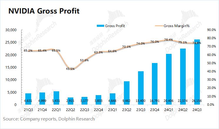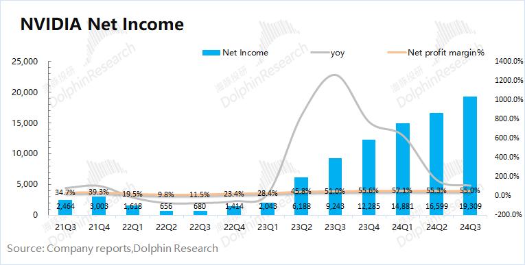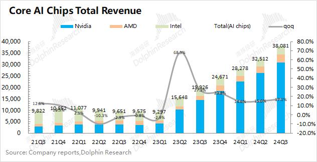 从下季度资本开支的预期情况看,四家公司下季度资本开支合计约为696亿美元,同比增长59%,环比增长7.2%。而同时AMD给出了相对疲软的AI指引,海豚君认为下季度核心公司加大了对英伟达产品的采购力度,并开始出货Blackwell新品,公司有望进一步提升在AI chips的市场地位(当前份额80.8%)。这也给公司下季度375亿美元的指引,提供了明显的增量支持。