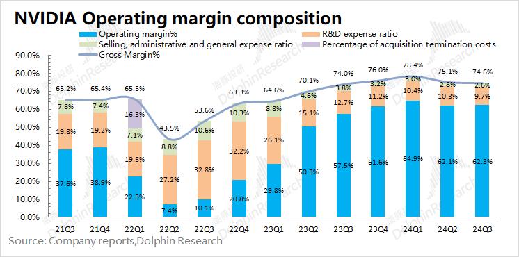 2025财年第三季度英伟达营业利润率为62.3%,环比保持稳定。公司本季度费用率的下滑,抵消了毛利率环比下滑的表现,最终经营利润率保持平稳。