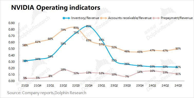 1)存货/收入:本季度比值22%,环比持平。公司本季度存货回升至76亿美元,其中一部分是用于Blackwell的产品备货。而和公司高增长的收入相比,公司存货占比仍处于历史低位。结合公司持续提升的增长指引看,公司产品当前仍处于供不应求的局面,毛利率也将继续维持在相对高位;