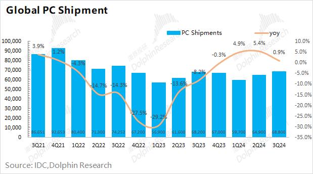 此外PC市场的整体表现,也将对公司的游戏业务产生影响。根据IDC最新的数据,2024年三季度全球PC市场出货为6880万台,同比增长0.9%。随着PC市场的整体修复,对AMD、英特尔的PC业务直接增益。而由于游戏显卡主要搭载在PC上,因此对独显也有一定的带动作用。而在近段时间AMD游戏业务继续回落,英伟达游戏业务持续增长,公司在独显市场的份额也是有所提升的。