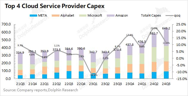 由于数据中心AI芯片的收入,主要取决于下游云厂商的资本开支情况。结合四大核心云厂商(meta、谷歌、微软和亚马逊)的情况,海豚君预计下季度四家合计资本开支达到696亿美元,环比增长7.2%。与AMD疲软的指引相比较,市场增量基本都被英伟达给拿下,下季度公司在AI芯片市场中的份额有望进一步提升。