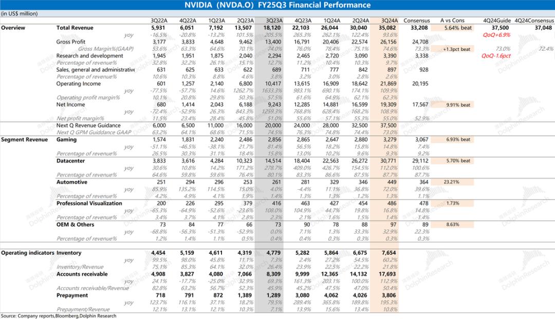 4、下季度指引:英伟达预计2025财年第四季度收入375亿美元(正负2%),同比增长69.7%,好于彭博一致预期370亿美元;第四季度毛利率73%(正负0.5%),好于彭博一致预期72.4%。