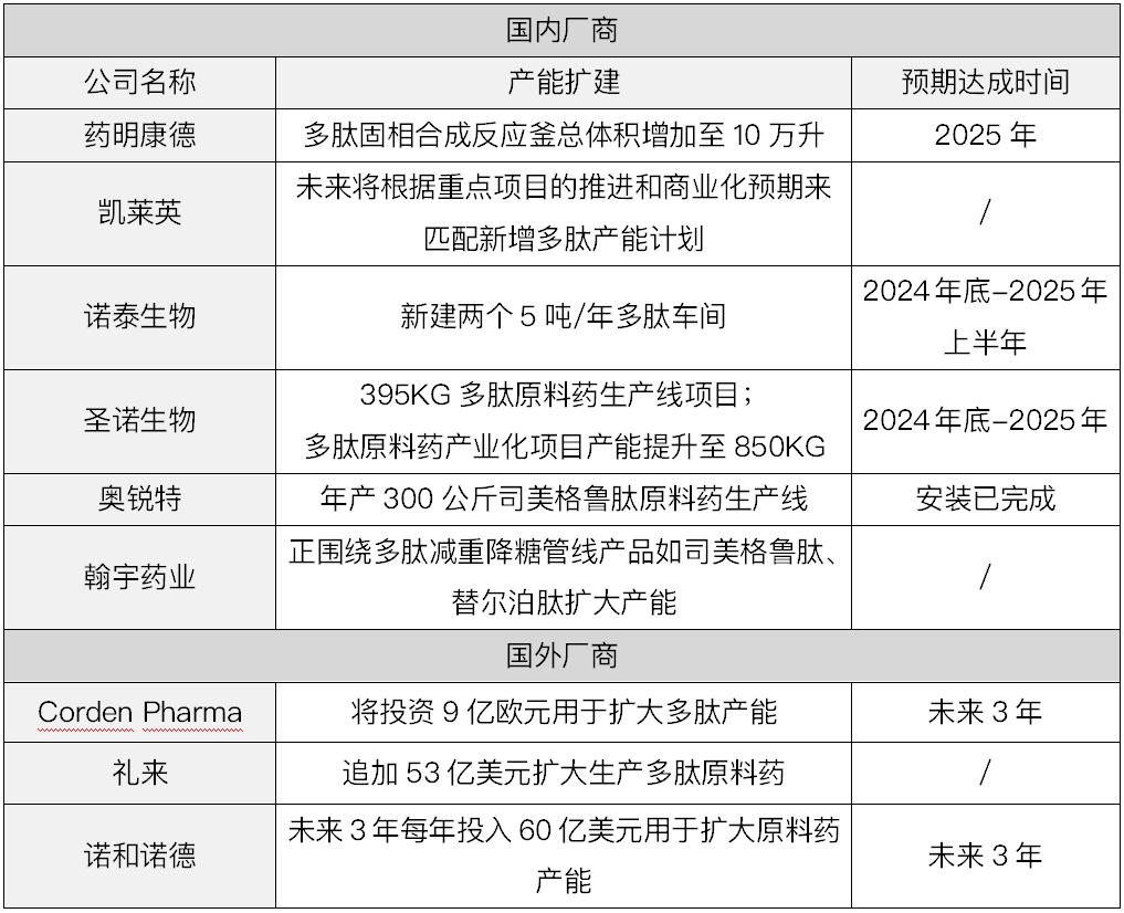 今年以来,国内厂商已经有药明康德、凯莱英、诺泰生物、圣诺生物、奥锐特以及翰宇药业在扩张多肽类原料药的产能;同时,国外的厂商也在扩产,如原研厂商诺和诺德与礼来,均将斥巨资扩大原料药产能。