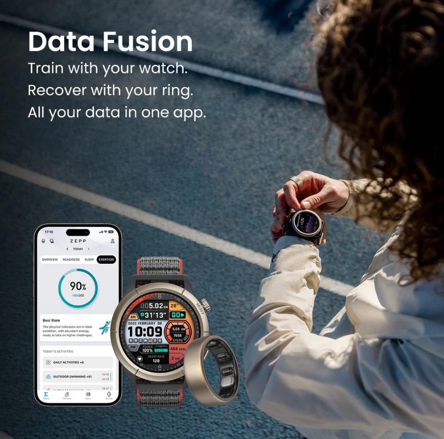在交互性上,它可以与 Amazfit 手表协同使用,提供更精准的运动健康数据。
