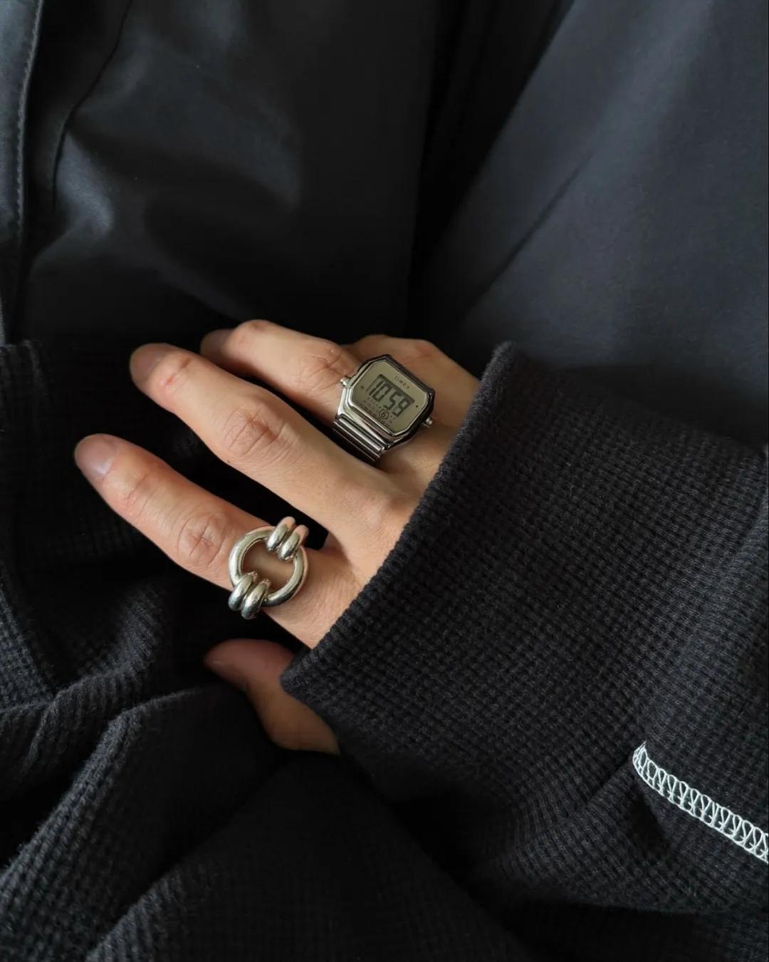这个戒指表精致小巧,表壳仅有 1 英寸左右,但卡西欧还是设法塞进了一个复古六段式 LCD 屏幕,可以显示小时、分钟和秒。