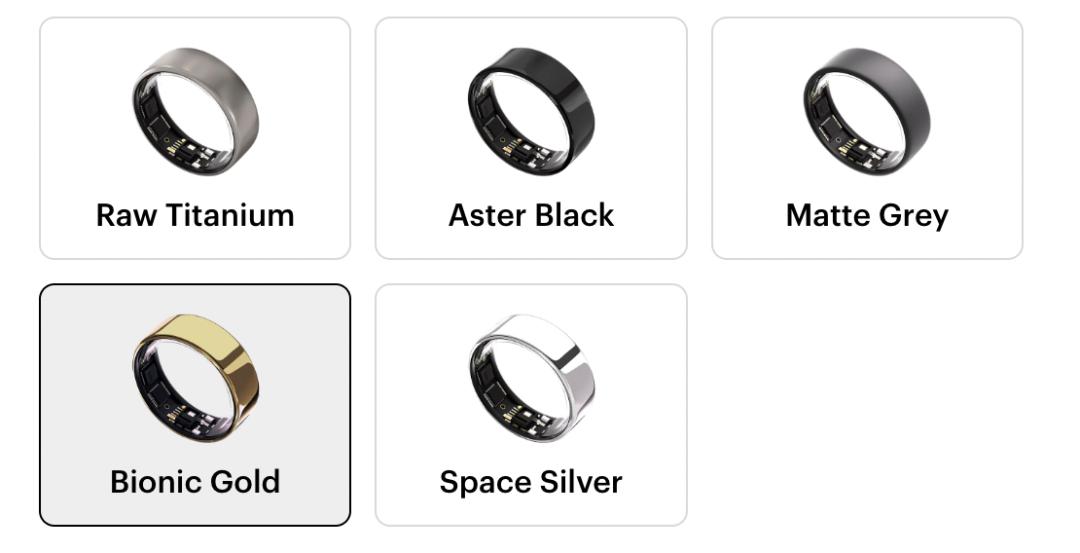 Ultrahuman Ring AIR 有 5 种颜色,分别是原钛、紫菀黑、哑光灰、太空银、仿生金。