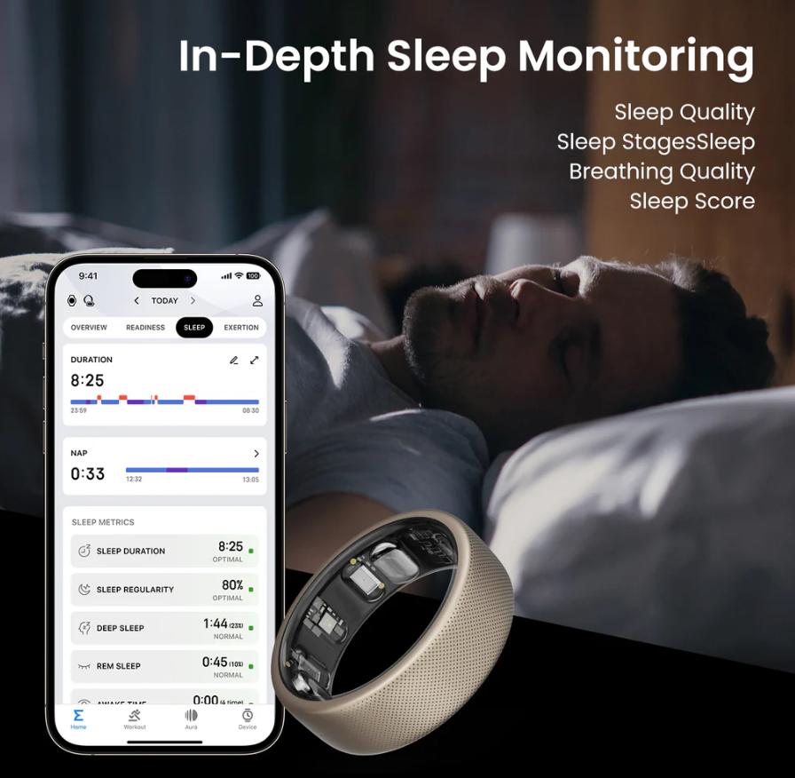 它外观为亲肤钛金属设计,能够提供心率、血氧和压力情况的监测,还可以提供详细的睡眠追踪和运动恢复统计数据。