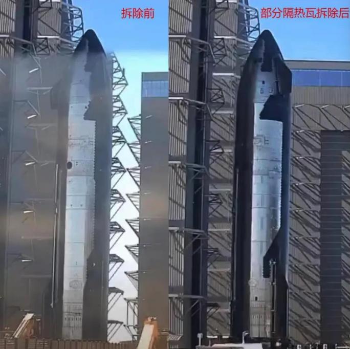 拆除了两侧的部分功超过 2100 片隔热瓦,据了解,这部分位置将是未来筷子发射( 回收 )架捕获星舰飞船的起落架位置。