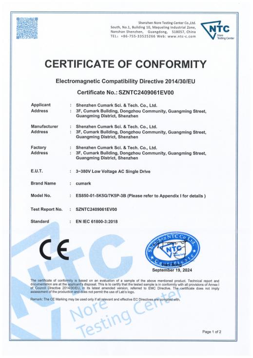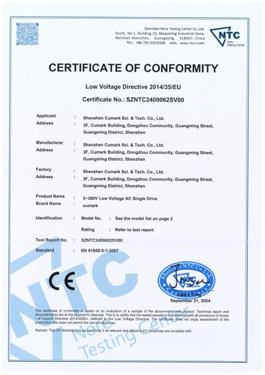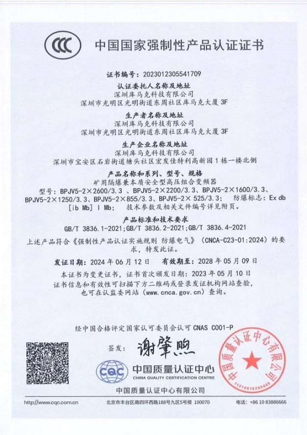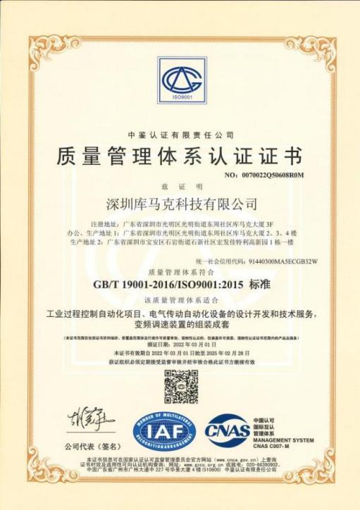库马克在产品开发过程中,一切以客户为中心,注重产品的品质和性能。其研发的高性能、高效率特种变频驱动器系列产品, 技术达到国际领先水平, 一经推向市场,便广受国内外客户好评。这些产品具有极高的可靠性,通过了欧盟CE认证、欧盟IEC61800 STO安全力矩停止认证、中国国家安全生产MA矿用设备安全认证、中国国家安全生产Ex db 【ib Mb】I Mb防爆认证等,可以更好地满足现代制造业安全生产的需要。库马克尤为关注产品质量和使用安全,积极寻求更大的突破,使得变频器在恶劣的环境也能很好地工作,并确保使用安全和用户的正常生产。