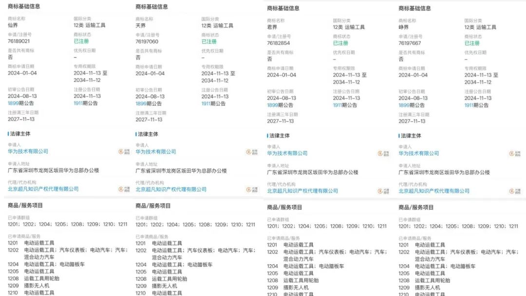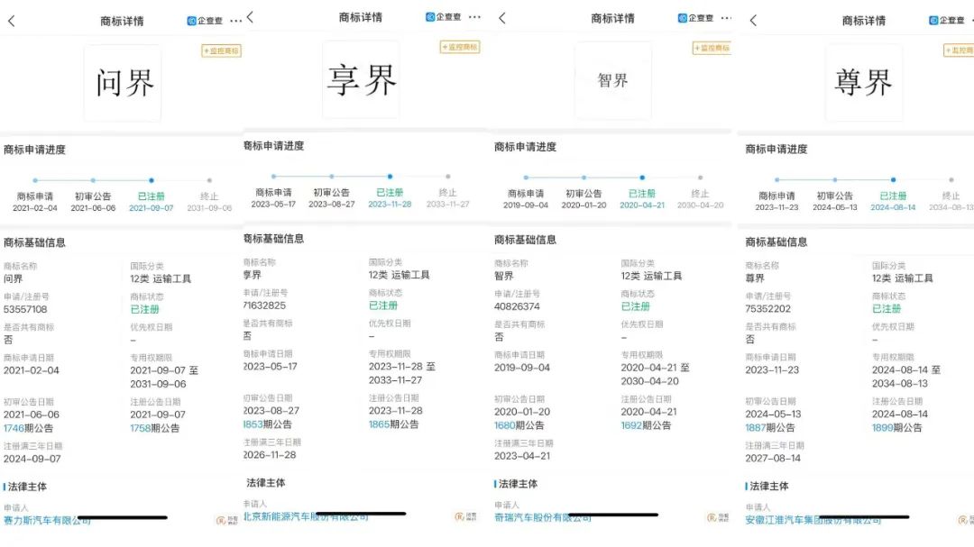 此前,华为注册了“问界”、“享界”、“智界”、“尊界”等同为12类运输工具的商标,上述“四界”的商标去向如下: