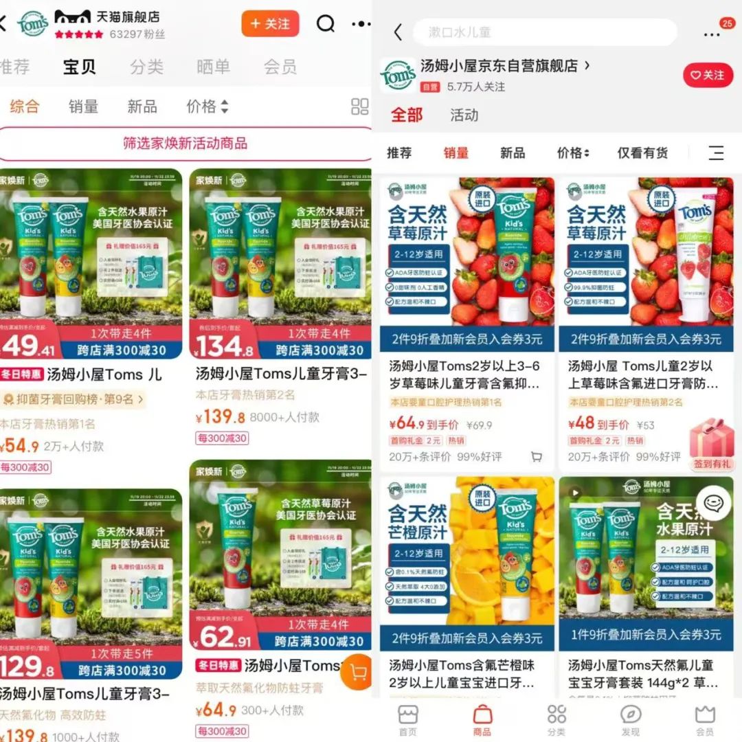 青眼调查发现,Tom's of Maine品牌已进入中国市场,并在淘宝、京东上设有汤姆小屋洗护旗舰店、汤姆小屋京东自营旗舰店。据了解,目前Tom's of Maine品牌天猫旗舰店共有6.32万粉丝,产品线涵盖儿童牙膏、漱口水,成人牙膏、漱口水。其中,草莓味牙膏表现出色,跻身天猫抑菌牙膏热卖榜第9名。从天猫网店经营资质来看,该店铺经营者为高露洁棕榄中国。