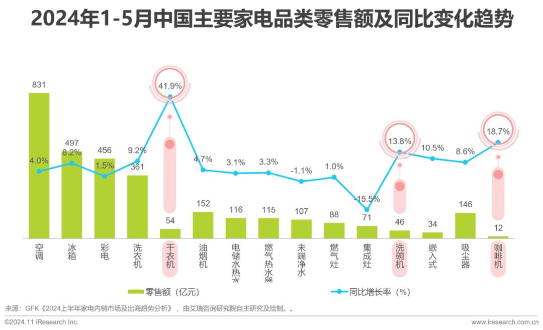 在当前家电市场整体保有量较高的背景下,新兴品类如干衣机、咖啡机、洗碗机等仍展现出强劲的增长势头。2024年1月至5月的销售数据显示,这些新兴品类正处于普及阶段,同比增长显著,成为市场的增长亮点。面对这一市场机遇,企业亟需数字化转型:通过大数据分析消费者需求进行产品研发;借助数字化营销推广新兴产品,提高品牌知名度和曝光度;运用数字化技术实现智能化生产,以提高生产效率和生产质量,降低生产成本,增强竞争力。