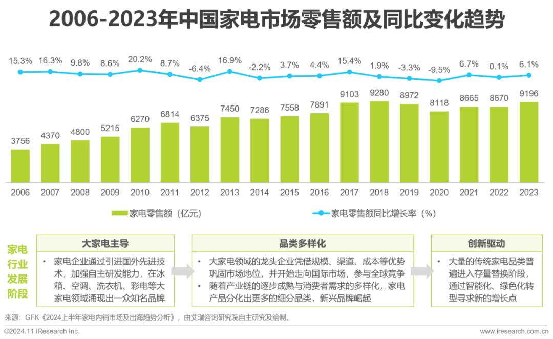 中国家电行业经历了传统大家电普及到品牌多样化的发展阶段,从“彩冰洗空”到厨房电器、清洁电器、个人护理电器等,家电品类逐步丰富。2023年中国家电零售额达到9196亿元,2020年到2023年的复合年增长率约为4.2%。行业整体步入以换新需求为主导的慢增长周期,竞争重点也由粗放式增长转向精细化运营。