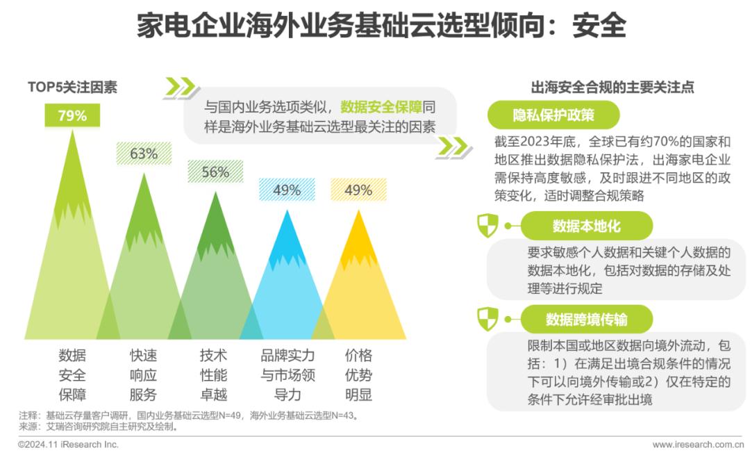 近年来,全球各地区对数据保护和隐私的关注度不断提升。由于不同国家和地区在安全合规方面的要求不尽相同,家电企业在出海过程中首要关注的即是安全问题。调研数据显示,79%的家电企业认为数据安全合规是影响海外业务基础云选型的关键因素。通过与基础云厂商合作,家电企业可以有效规避潜在的合规风险。在对各地区政策法规充分了解的基础上,家电企业可以进一步利用相关的推动性规范,降低跨境管控的成本压力。