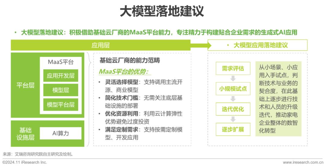 大模型时代开启后,人工智能的内容生成能力倍受关注,家电企业纷纷探索生成式AI能力在企业研、产、供、销、服等环节的应用,以跟上技术革新热潮,提升业务创新速度。考虑到大模型能力的获取需要较高投入成本,报告建议家电企业借助基础云厂商的MaaS能力,做到低成本快速获取贴合家电企业需求的大模型能力,让家电企业能够专注精力于构建生成式AI应用。在构建应用时,家电企业可从小场景进行应用试点,积累契合度,进而推动企业整体实现智能化转型。