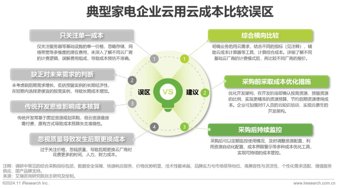 调研发现,多数家电企业在采购云服务时,往往过分强调价格,忽视全面评估的必要性。同时,即使在价格对比时,企业也存在多个判断误区,导致最后的选择并不真正“划算”。常见的价格对比误区包括:只关注单一成本、缺乏对未来需求的预判、传统开发思维导致资源预算失准、忽视质量导致后期成本增加。为了避免这些问题,建议企业在采购前即采用云原生开发思维优化架构,不仅可以准确预算资源,还可以优化长期用云成本。而在采购阶段,企业应综合评估多个指标,适当降低价格的决策权重。采购后,企业可以通过持续监控并利用云成本优化工具,进一步降低开支,确保采购的云服务发挥最大性价比。