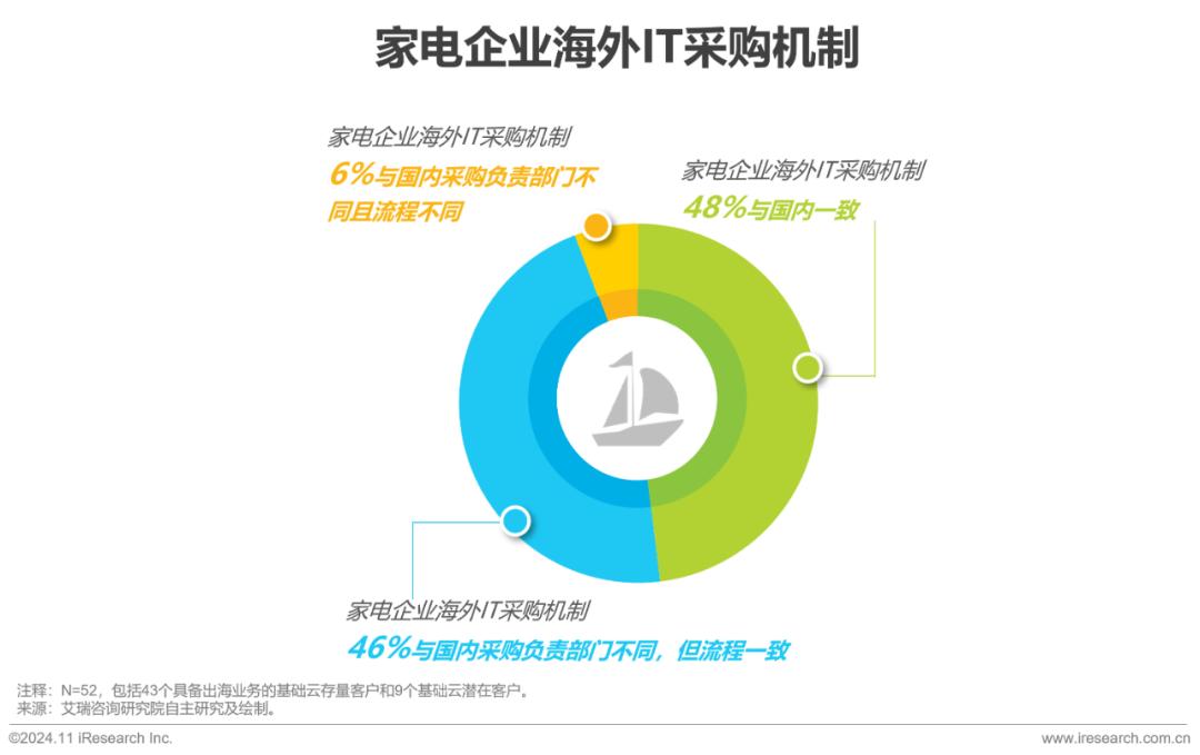 被调研企业中,88.1%的家电企业表示正在开展或规划海外业务。出海初期,家电企业通常不会设置独立的海外IT团队,而是会随着海外业务和团队规模的扩张,逐步考虑成立海外事业部或分子公司。但即便拥有了独立团队,海外的IT采购流程也基本同国内一致。