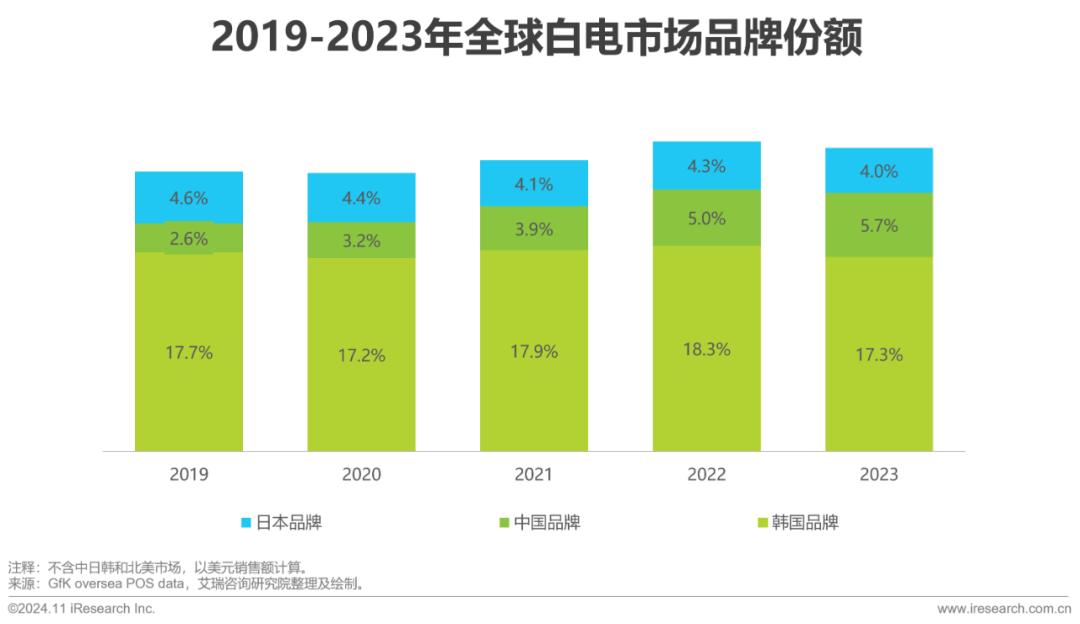 面对中国家电市场的饱和态势,众多家电企业将目光投向海外。根据海关总署数据,2024年1月-7月,包括电扇、洗衣机、吸尘器、微波炉、液晶电视在内的家电累计出口4091.9亿元,同比增长18.1%。与早期的ODM模式不同,这一阶段的家电企业出海更倾向于在新兴市场开店设厂,并且开始逐渐从单纯的产品出海向高附加值的品牌出海转变。以白电为例,中国家电品牌持续压缩日韩等其他国家品牌的市场空间,在海外市场的份额已经由2019年的2.6%增加到2023年的5.7%,国际影响力进一步提升。