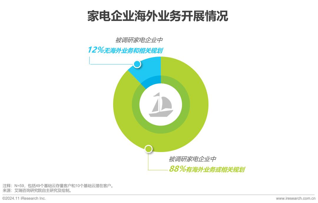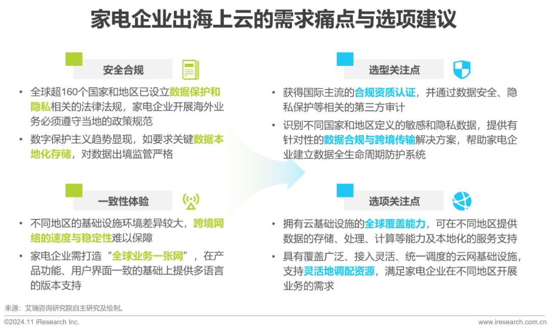 - 在所有被调研企业中,近九成的家电企业谋求出海,安全与合规问题是出海企业的核心关注点,多数企业出海上云更倾向海外基础云品牌。
