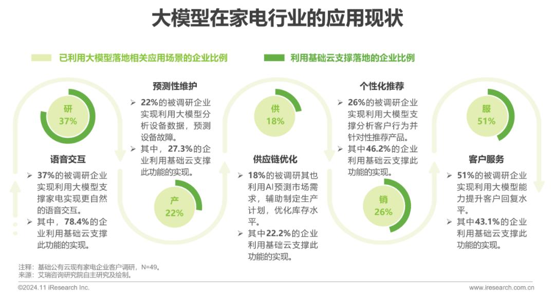 - 在所有被调研企业中,61%的企业已经使用基础云支撑大模型应用,并更关注基础云厂商提供的MaaS能力进行应用搭建,以快速降低大模型应用门槛;在开展全屋智能的家电企业中,五成企业已经率先利用基础云支撑智能家居业务运营。