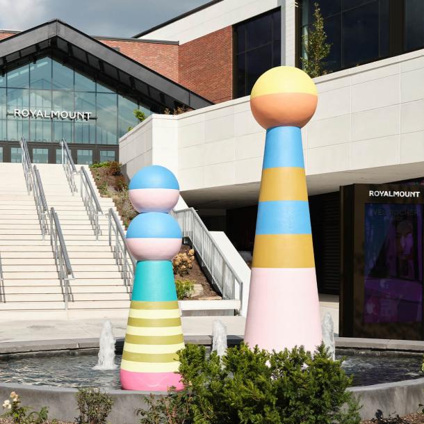 Royalmount对艺术调性和氛围的打造也是下了功夫,联合全球知名艺术咨询和制作经理人公司MASSIVart与30多位知名和新兴艺术家在整个商场打造艺术公共空间PARCOURS D'ART PUBLIC,从室外到室内,共计展出壁画、雕塑等共计60多个艺术装置。