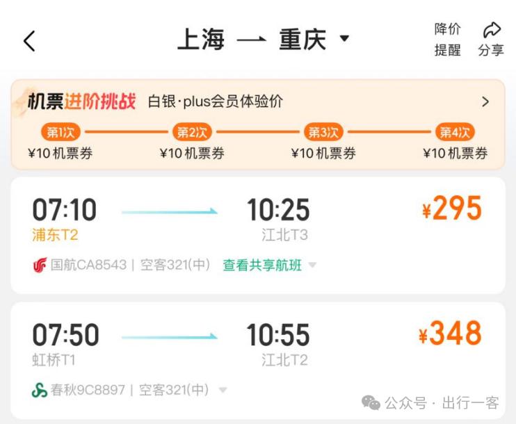 有时,同一航线的同天航班,全服务航空的部分经济舱票价甚至比廉航的票价更便宜。例如,在“去哪儿”平台,11月16日从上海直飞重庆的国航CA8543航班,经济舱票价仅为295元(不含燃油附加费),比同一时间段春秋航空的票价还低。