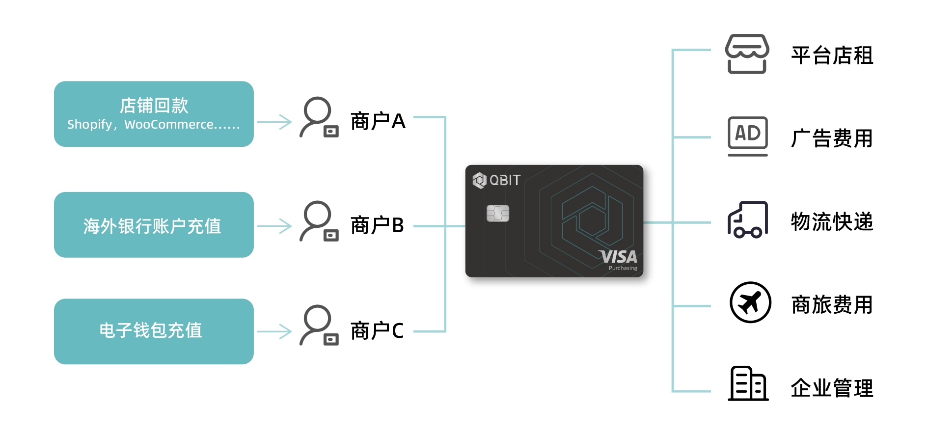其中,Qbit的主营产品量子卡可供企业级客户进行花销管理,包括广告投放、红人营销、境外商旅、跨境贸易、产品采购、国际物流、平台店租等用途;充值方式支持跨境电商店铺回款、海外银行账户、海外电子钱包账户等。