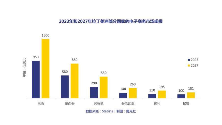 Claudia的体验,是拉丁美洲电商平台在近年内飞速增长的缩影——据Statista旗下“数字市场观察”统计,2023年拉美地区电商市场销售额超过1170亿美元,预计2028年销售额有望达到2050亿美元。巴西、墨西哥、哥伦比亚、智利等高人均收入国家的电商增速,也正在领跑整个拉美地区。