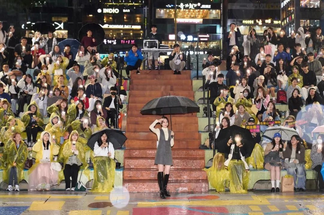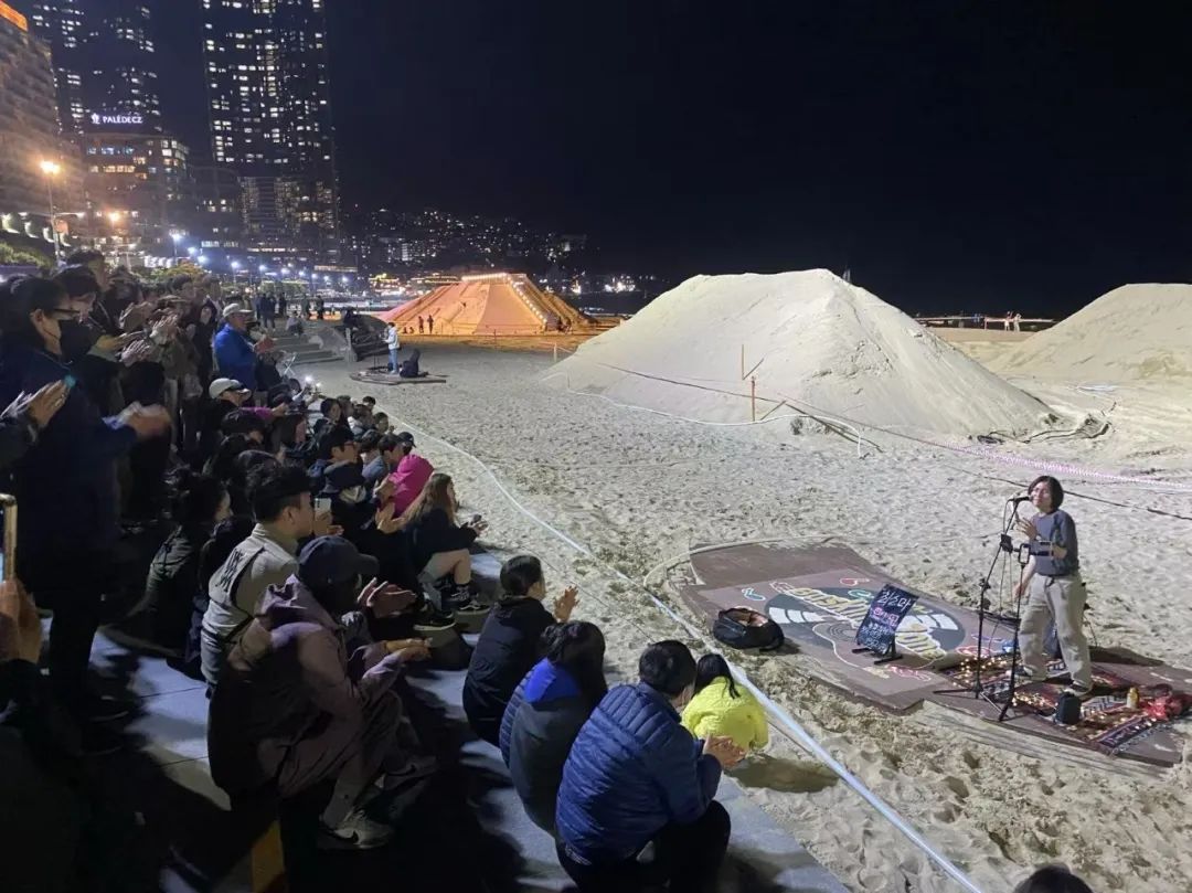 △夜晚,釜山沙滩就成了素人歌手大舞台,友善的路人粉纷纷挥起了手机里的荧光灯。(图/道喵叽)