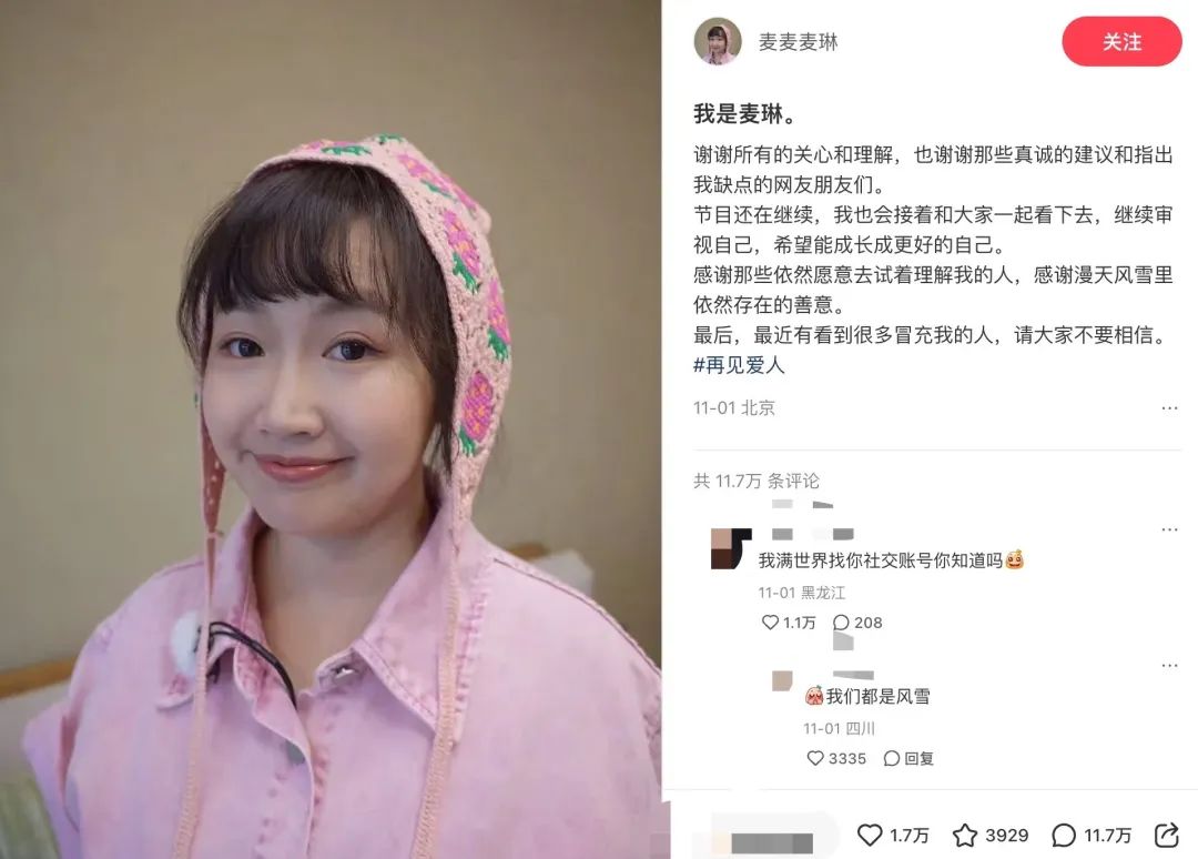 麦琳在某社交媒体的账号,只有2.6万粉丝。唯一一条帖子下面,却有11.7万条评论。