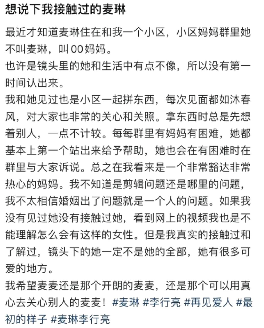 上周四之后,陆陆续续有麦琳和李行亮的现实好友替他们发声。