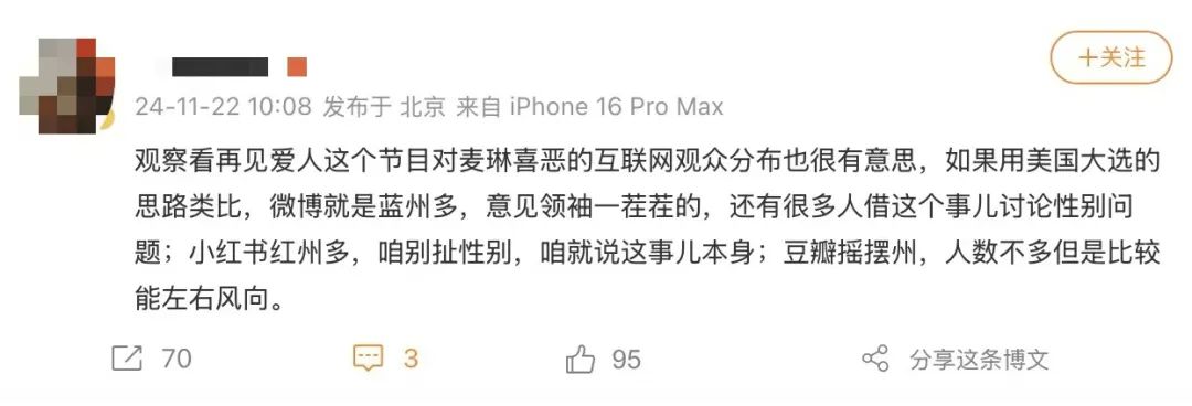 有网友甚至用美国大选类比,总结了微博、小红书和豆瓣三个平台声量最大的人群特征。