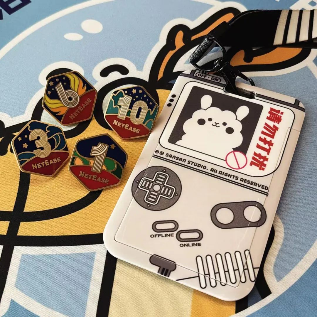 闻烜当时的网易工牌和入职10年来的纪念徽章。(图/受访者供图)