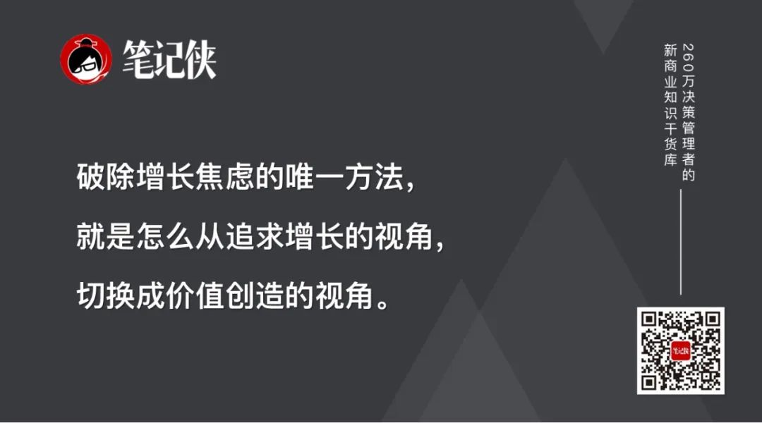 李靖(李叫兽)在《越想增长,越难增长》一文中总结:破除增长焦虑的唯一方法,就是怎么从追求增长的视角,切换成价值创造的视角。