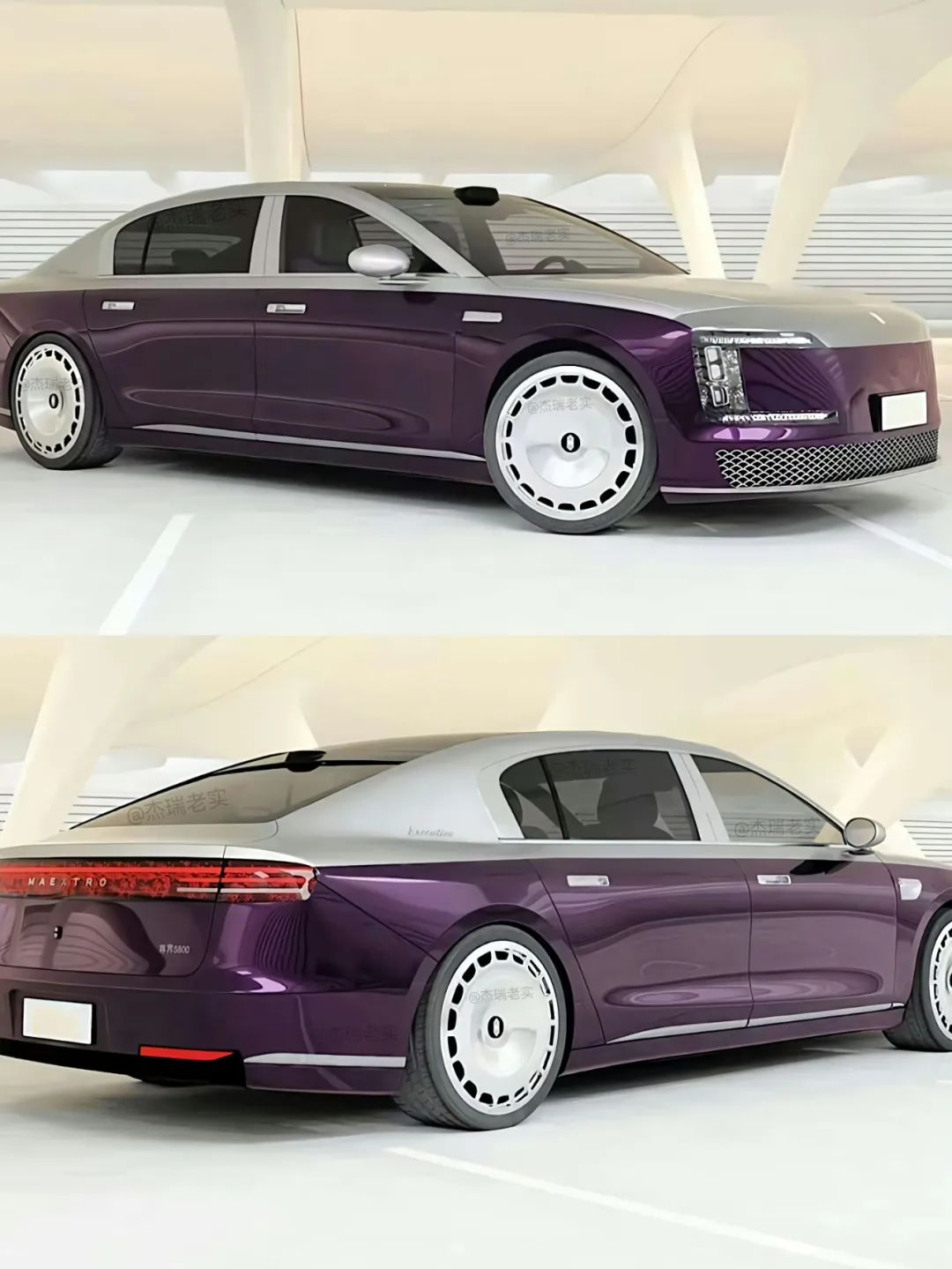 根据目前透露的信息,尊界S800 采用了银色 + 紫色的双拼色车身,采用大饼式封闭轮圈,以及贯穿式星河尾灯。
