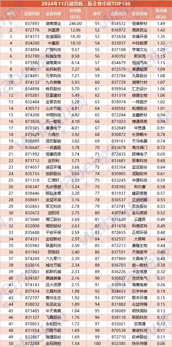 附-2024年11月湖南新三板企业市值TOP100(数据截至11月21日收盘)