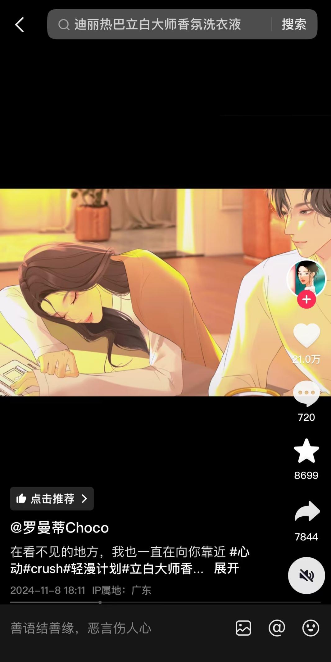比如罗曼蒂Choco本月初发布的一条视频,就在动画中设置了咖啡洒到男主身上的心动桥段。而此时,大显身手的不仅有男主,还有立白大师香氛洗衣液。洗衣液的瓶身图片就直接出现在了动画中。