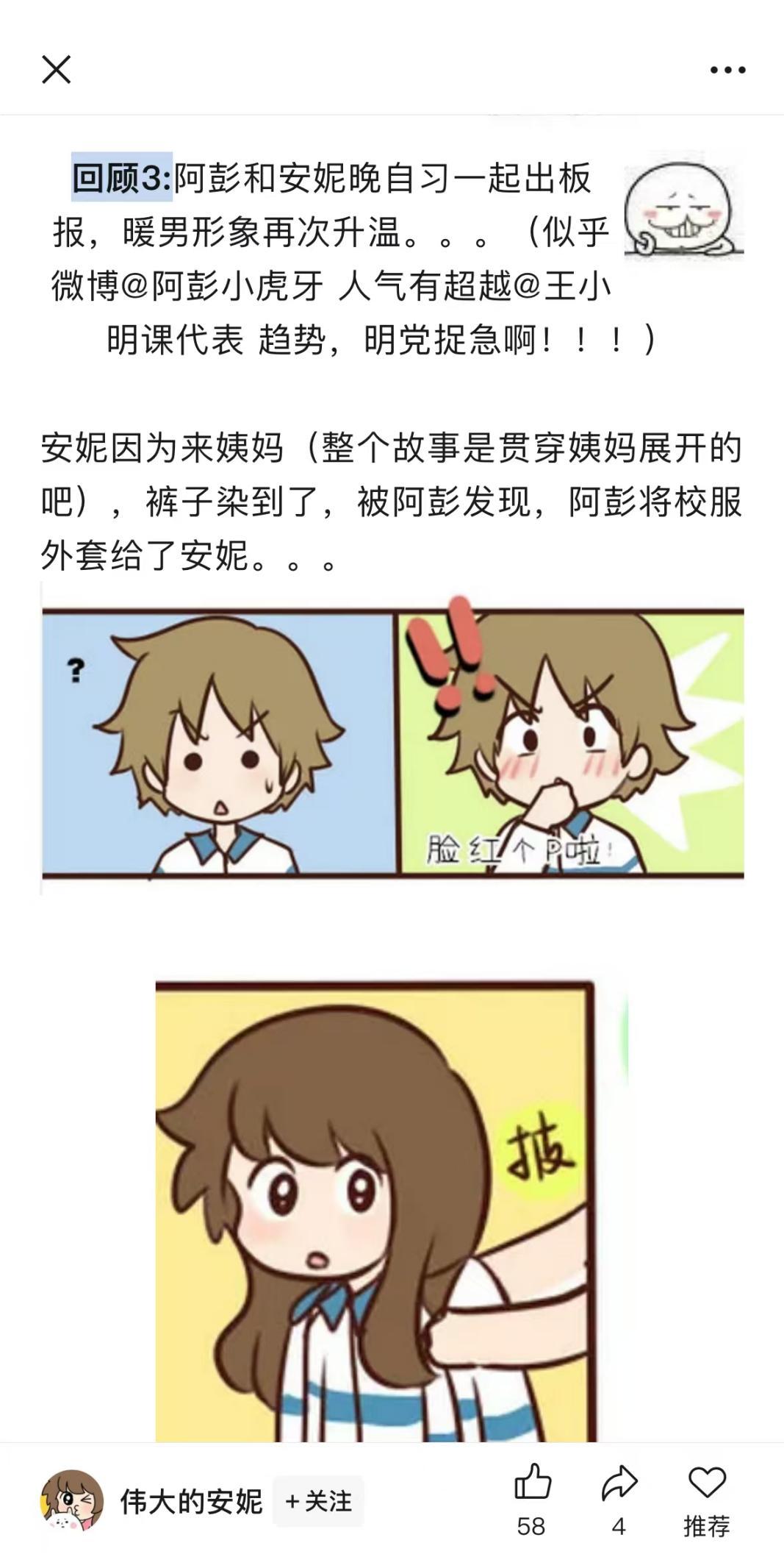 比如,《安妮和王小明》的故事中,王小明的另一个竞争对手阿彭是一个标准的暖男。陈安妮在自己漫画的文案中,直言“替明党捉急”。这种磕CP和党争的思路,在条漫领域是不多见的。因此,《安妮和王小明》形成了一种横空出世的势头。