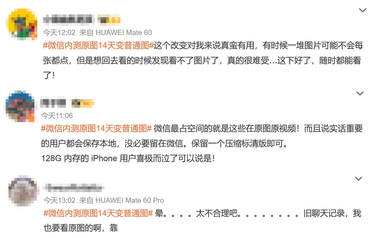 有的网友表示,以后再也不用忘记点击查看导致图片失效看不了;也有的网友表示,对于重要的图片和视频,用户会自己保存到本地,再留一份在微信里确实没必要,保留压缩标准版有个标记即可;还有网友则担心,旧聊天记录想看原图怕被清理成普通画质,目前来看通过关闭新功能选项来避免了。