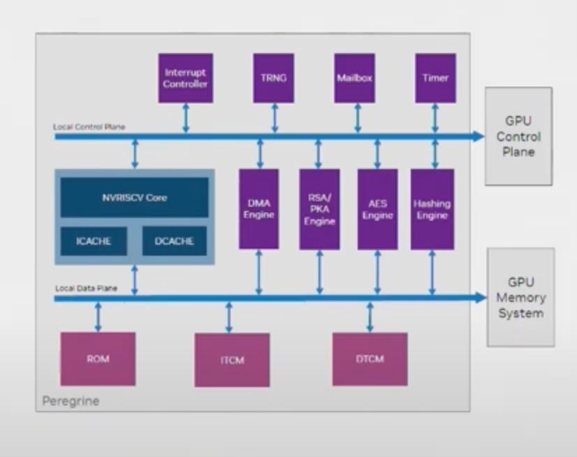从架构上看,Peregrine子系统由多个关键模块组成:核心模块是由NV-RISCV核心以及指令缓存(ICACHE)和数据缓存(DCACHE)组成。外设则包括中断控制器、随机数生成器、邮箱通信模块、定时器。加速引擎含有DMA、RSA/PKA、AES哈希引擎。存储系统包括ROM、ITCM和DTCM,与GPU控制平面和内存系统紧密集成。