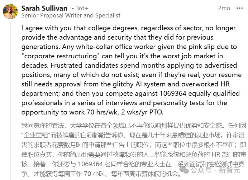 在教授的帖子下,不少人表示赞同:「如今美国的就业市场,可以说是处于几十年来最糟糕的时期。」