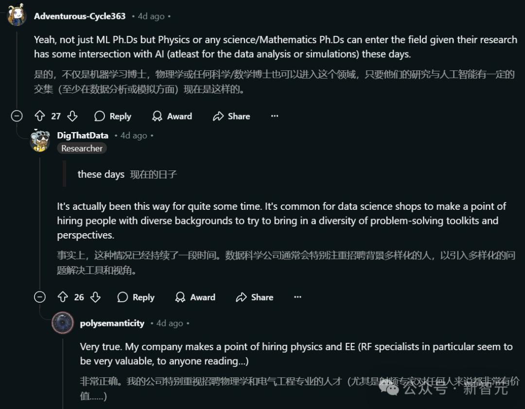 有人表示,原因在于AI领域太热门了,不仅是机器学习博士,物理学/数学/任何科学博士都能进入该领域,因为研究与AI有交叉。