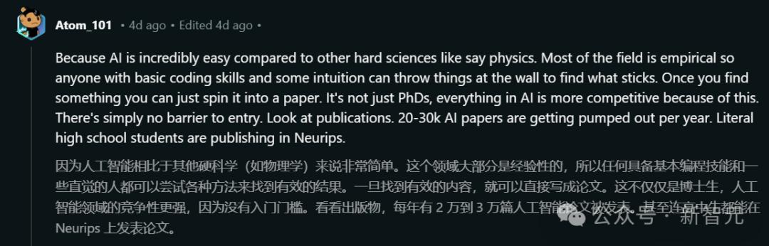 甚至可以说,跟物理学等硬核科学相比,AI太简单了。该领域的大部分内容都是经验性的,任何有编码技能和一些直觉的人,都能找到一些东西发成论文。所以每年都会有两三万篇AI论文面世。