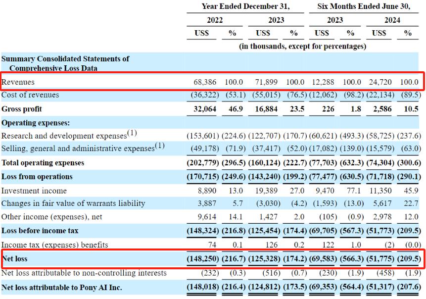 然而,这些数据的变化,并未直接带动小马智行经营利润的正向增长。据招股书内容,2024年前三季度,小马智行营收约3951万美元,同比增长85.5%;营收增长的同时,净亏损却高达9389万美元,远高于营收额。