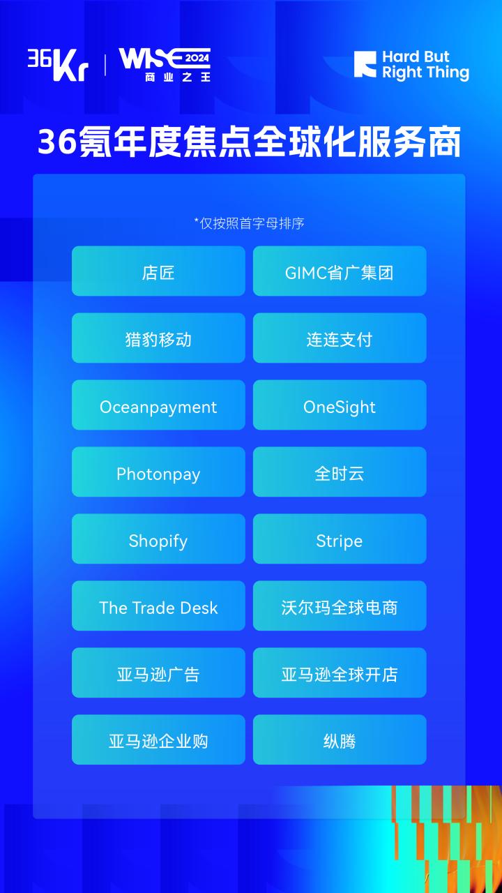 11月18日,由36氪主办的WISE2024“继续下沉”全球化分论坛在深圳落幕。本次论坛聚集了在八大新兴市场拥有成功出海案例的企业、投资人、政府产业人士、优质服务商等,共同探讨本土化实操干货。此外,论坛也集结了Stripe等全球化企服平台的产业链资源,能够有效辅助企业走出全球化展业的第一步。与此同时现场也发布了全球化年度焦点品牌企业和全球化年度焦点服务商企业调研结果。